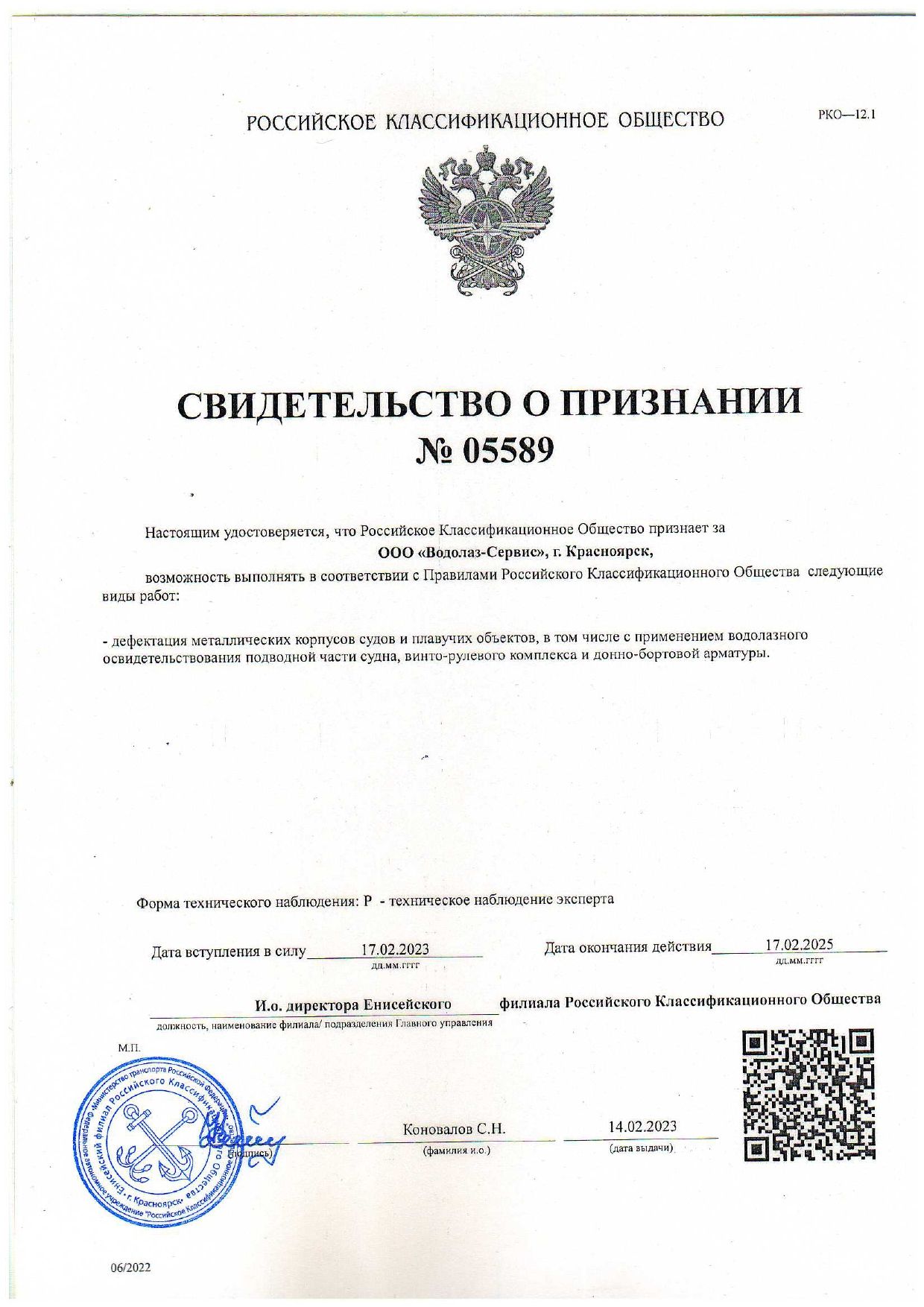 Certificate of recognition of the river register